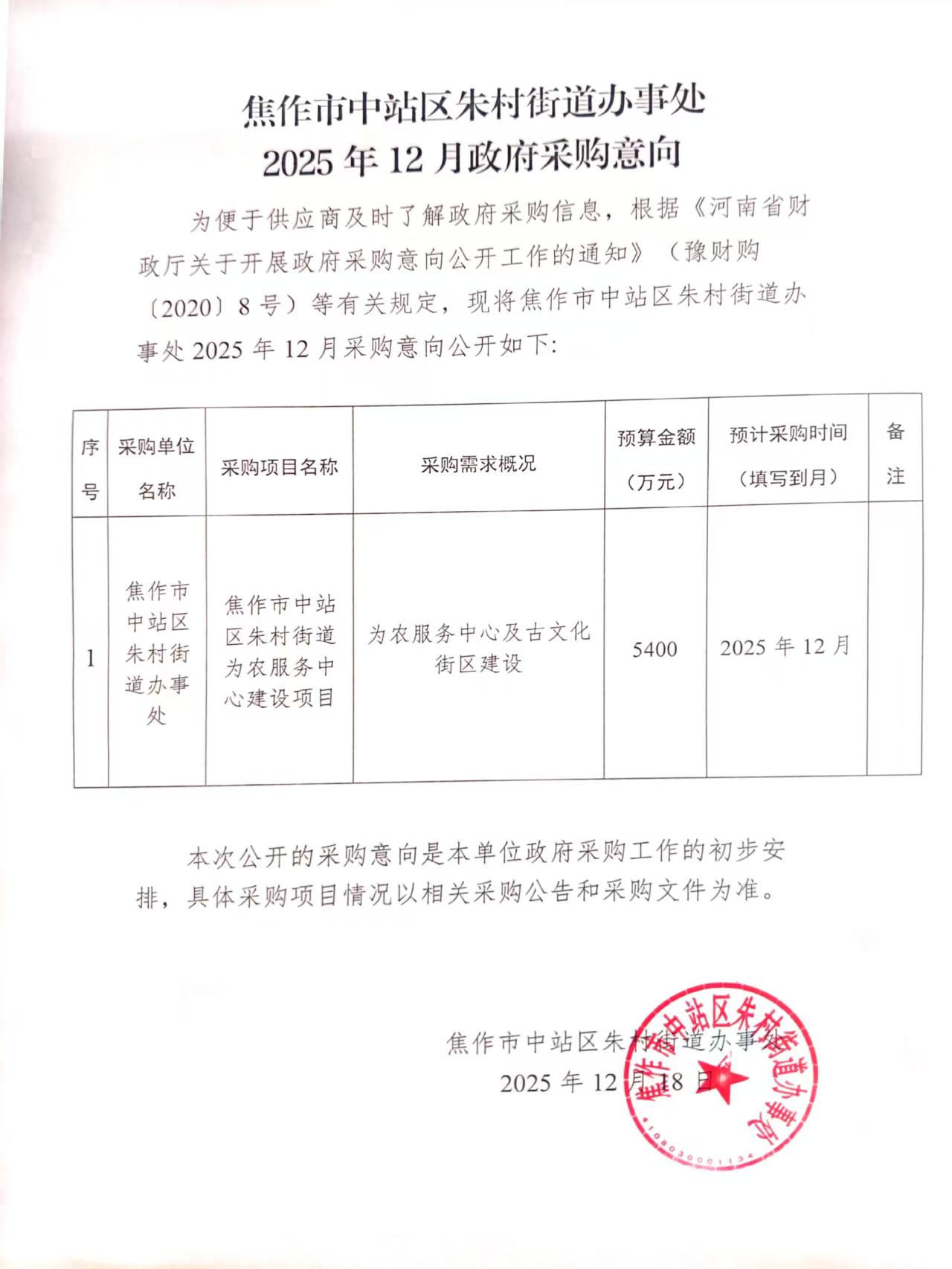 焦作市中站区朱村街道办事处2025年12月政府采购意向